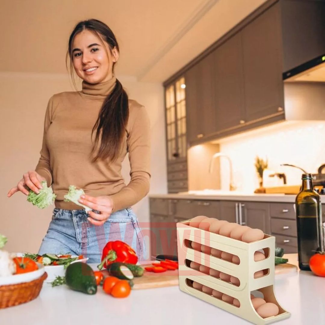 Dispensador De Huevo 4 Niveles Organizador de Huevos Huevera Porta huevo Caja de Almacenamiento de Huevos Deslizante - Estilo Escalera Descripción del Producto: Organiza tus huevos de manera eficiente y elegante con nuestro dispensador de huevos deslizante de 4 niveles. Este soporte automático es ideal para refrigeradores, permitiéndote acceder fácilmente a tus huevos mientras ahorras espacio. Características Principales: Diseño Rodante Automático: Equipado con una estructura de gravedad, este dispensador permite que los huevos rueden suavemente hacia adelante. Dispensa un huevo a la vez, evitando caídas o vuelcos, para un manejo seguro y cómodo. Ahorro de Espacio: Con capacidad para aproximadamente 30 huevos, este soporte es compacto y se adapta perfectamente a tu refrigerador o encimera. Elimina las cajas de cartón, manteniendo tus espacios limpios y organizados. Protección Especial: Incluye barandillas a los lados para mayor seguridad. La ranura deslizante está diseñada para mantener los huevos en su lugar, evitando roturas. Resistente y Duradero: Fabricado con materiales de alta calidad, este dispensador es resistente y duradero, ideal para el estilo de vida moderno en la cocina. Su diseño reutilizable asegura que tus huevos estén siempre bien almacenados. Variedad de Colores: Se envía en color al azar entre blanco, gris, amarillo y café claro, para que elijas el que mejor se adapte a tu cocina. Consejos de Uso: Ajusta la posición de los huevos en el dispensador si notas que se quedan atascados tras rodar en la bandeja. Esto garantiza un funcionamiento óptimo. Beneficios: Mantén tus huevos organizados y accesibles. Reduce el desorden en tu refrigerador. Prolonga la frescura y seguridad de tus huevos con un diseño eficaz. Organizador automático de huevos: ¡Haz de la organización de tu cocina una tarea sencilla y práctica con nuestro soporte dispensador de huevos!